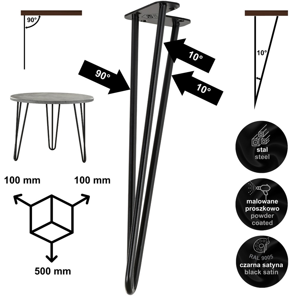 ✅ Hairpin legs przypominają kształtem spinkę do włosów. Trójnoga wykonana z trzech prętów stalowych, zapewnia solidność i trwałość.