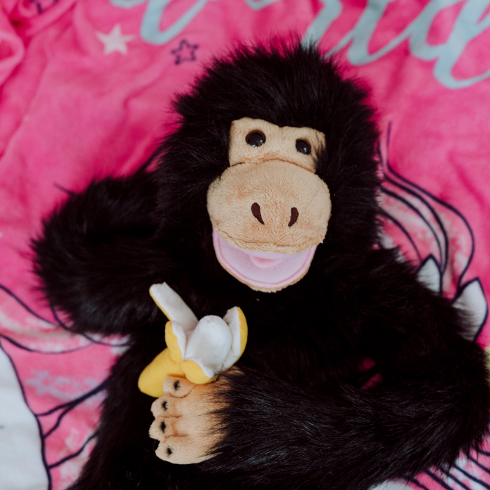 Szympans jest wykonany z miękkiego i przyjemnego futerka i uszyty jest z dbałością o każdy szczegół. Długie ramiona - ok 90 cm, mają przyszyte rzepy, dzięki którym można złączyć obie łapki Szympansa lub przyczepić dołączonego do zabawki pluszowego banana. Małpka może pełnić również funkcję maskotki a żeby użyć jej jako pacynki wystarczy nałożyć ją na dłoń wkładając rękę w jej pyszczek .