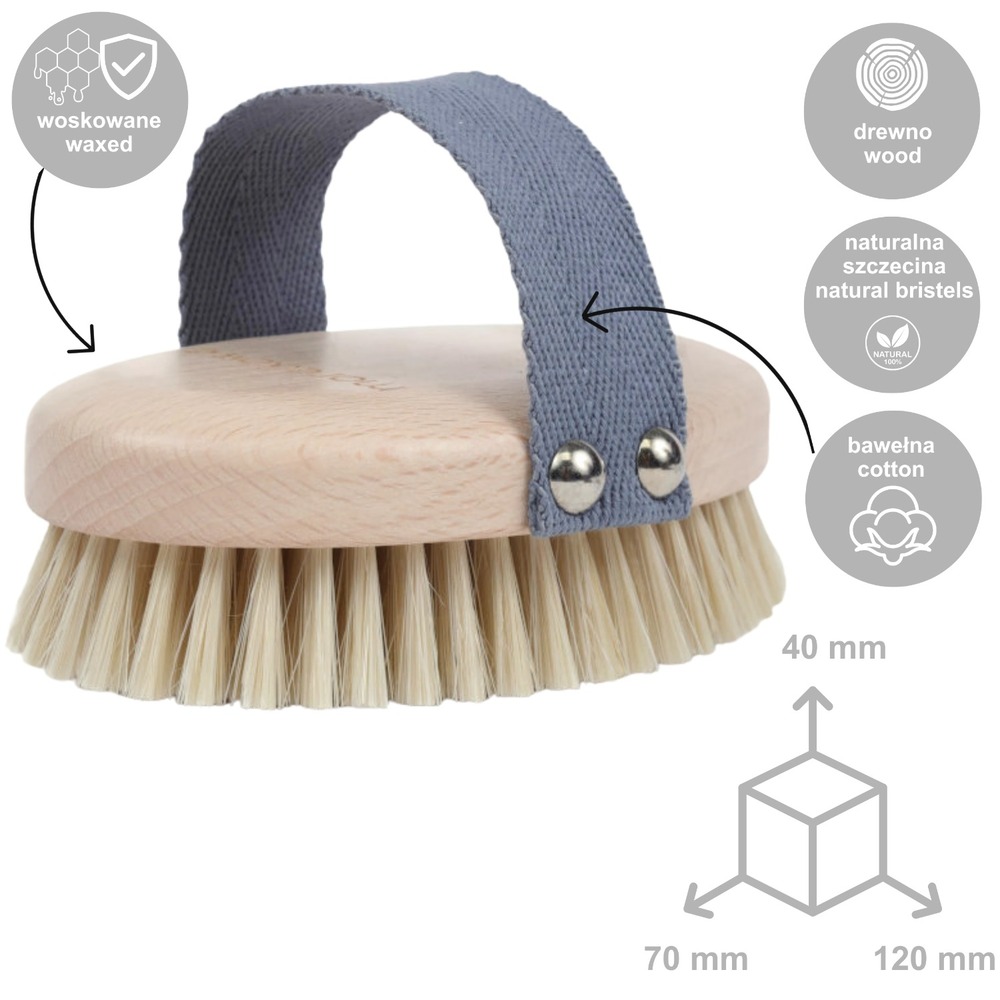 Rękojeść z naturalnego drewna bukowego, zabezpieczona woskiem, dobrze leży w dłoni i jest odporna na wilgoć. Szara bawełniana przepaska podkreśla elegancki, minimalistyczny styl szczotki i zapewnia wygodny chwyt.