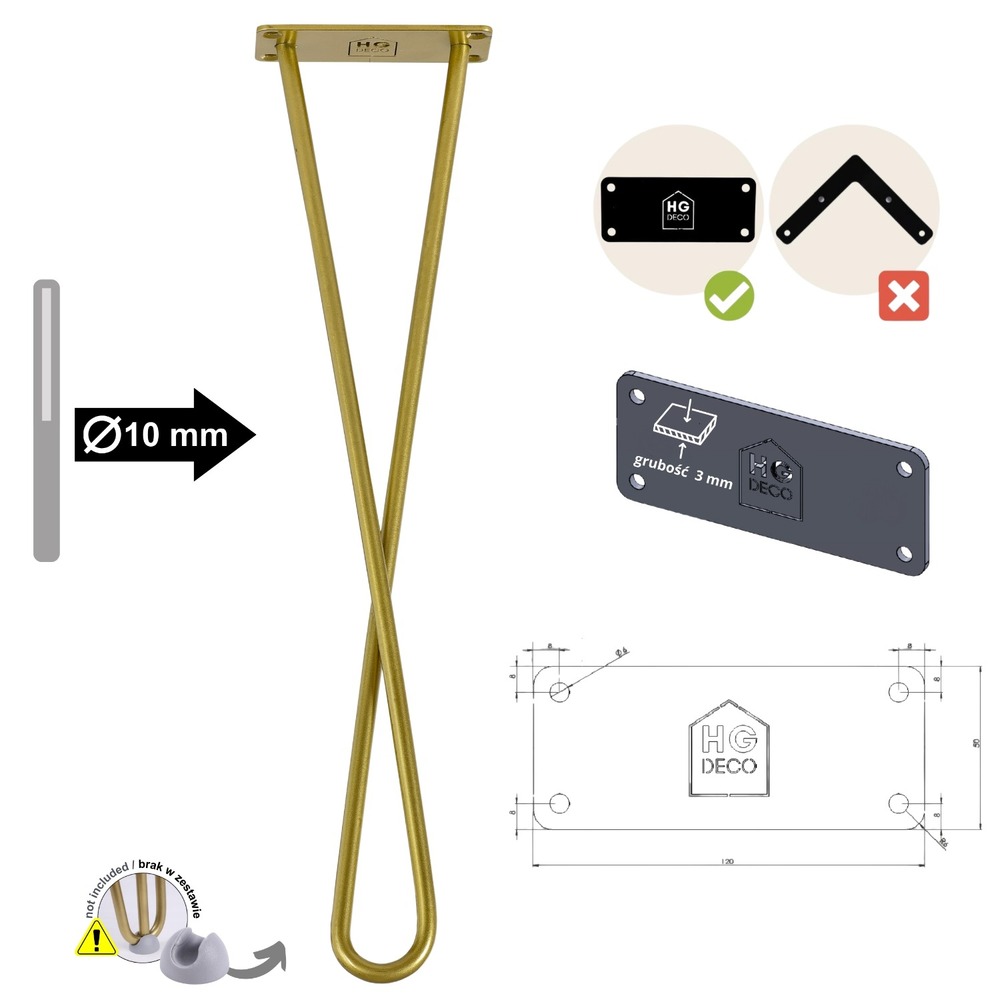 Metalowa noga meblowa DX50 marki HGDECO w kolorze Premium Gold to autorski projekt typu hairpin legs Twist, który stanowi nowoczesną interpretację klasycznej formy hairpin. Skręcona konstrukcja nadaje meblowi dynamiczny, elegancki i rzeźbiarski charakter, przy zachowaniu wizualnej lekkości.