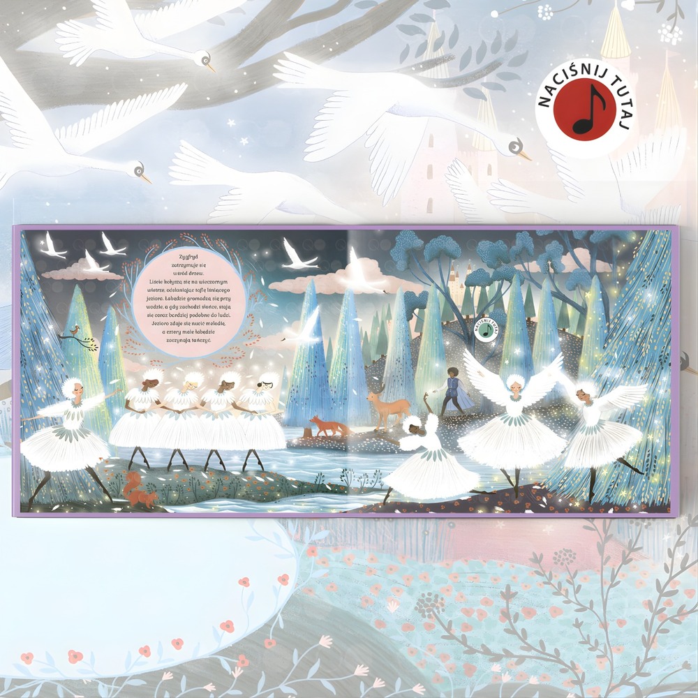 Każda malownicza scena kryje przycisk, który uruchamia fragment orkiestralnego wykonania „Jeziora łabędziego”. Dziecko może usłyszeć 10 fragmentów muzyki Czajkowskiego – od delikatnych melodii po monumentalne tematy baletowe – i poczuć magię prawdziwego spektaklu.