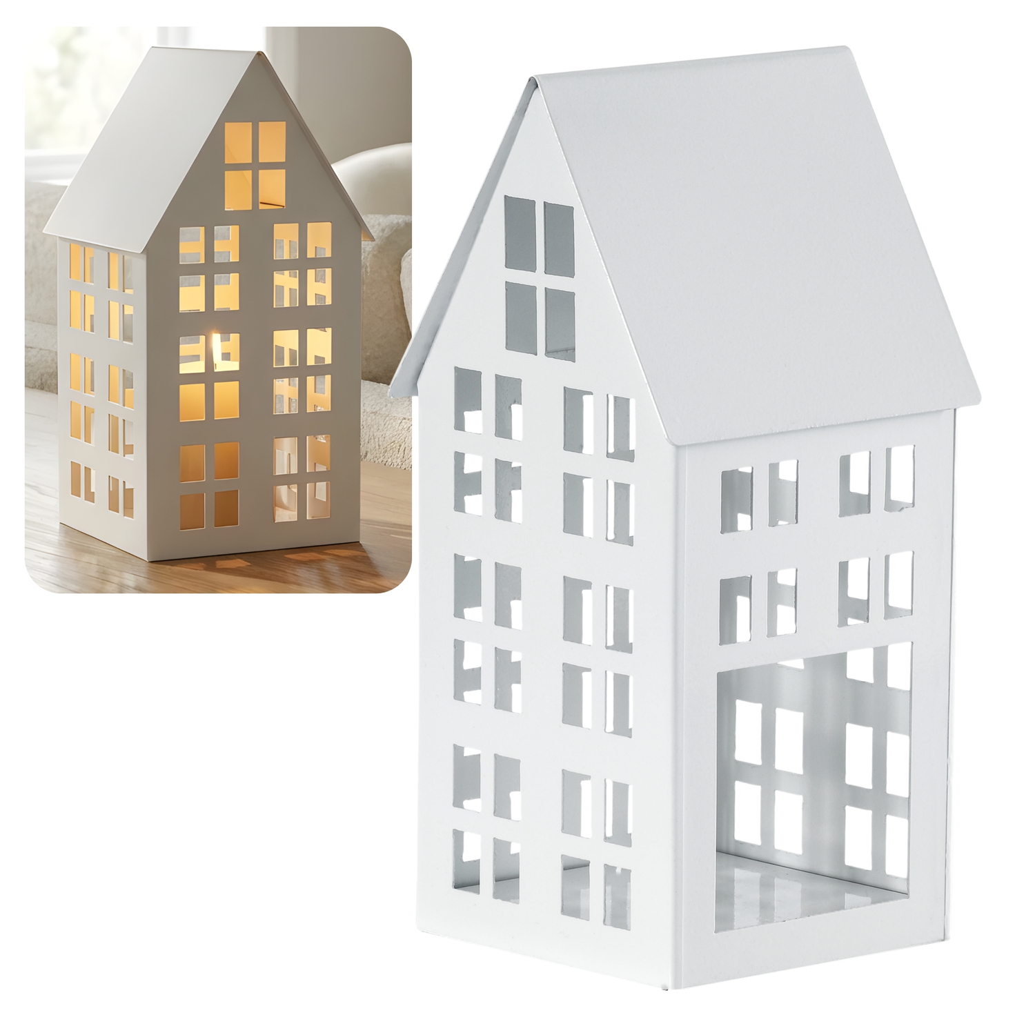 Ten metalowy domek to dekoracja, która odnajdzie się w każdym miejscu. Postaw go na stole w jadalni, na kominku, w łazience przy wannie lub na tarasie po zmroku. Zimą rozświetli domową przestrzeń obok choinki, a latem stworzy przytulną atmosferę w ogrodzie lub na balkonie. Zestaw kilka lampionów w różnych rozmiarach, by zbudować urokliwą dekorację
