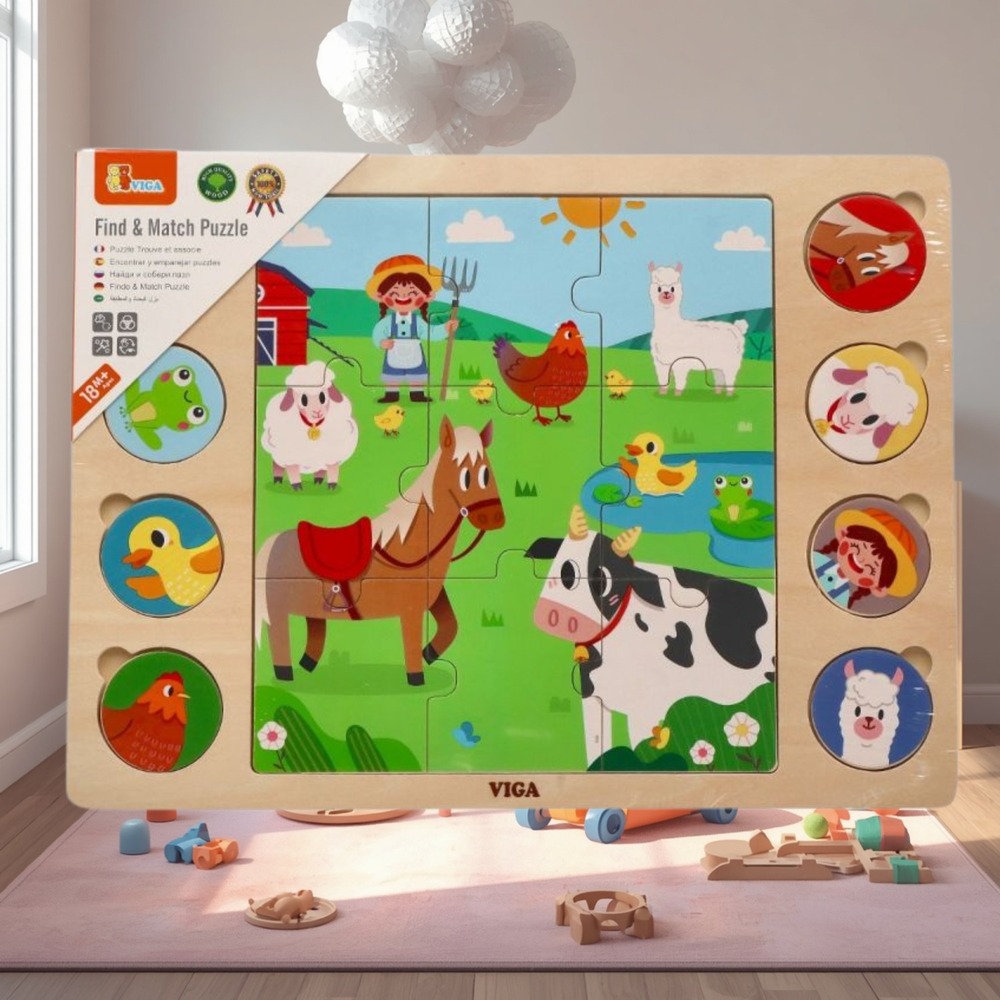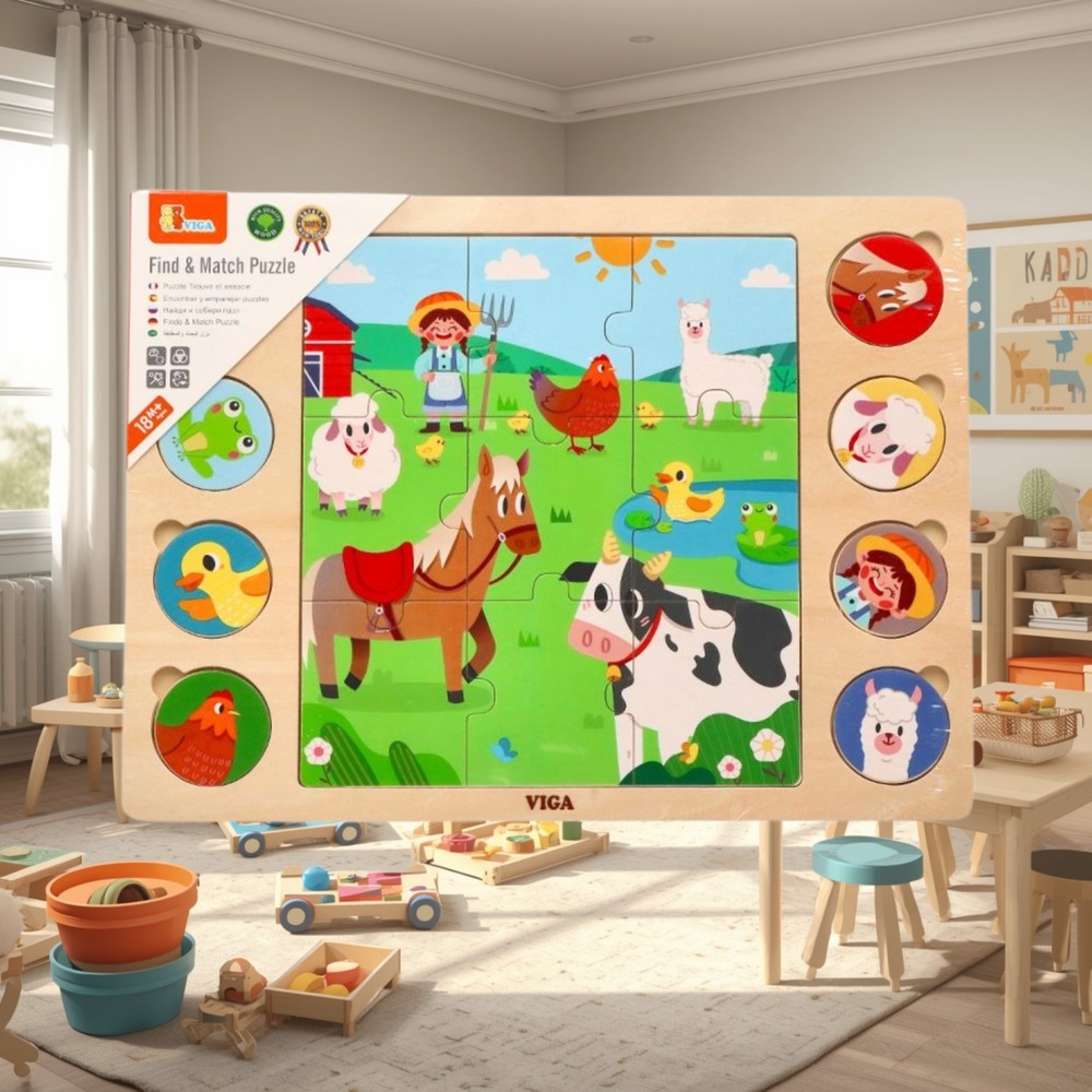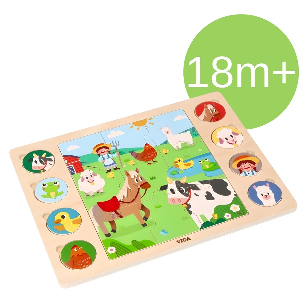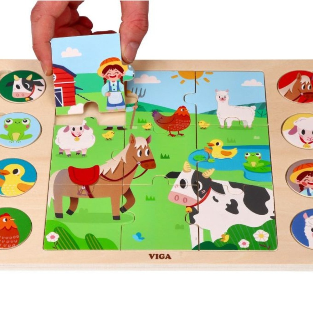 Puzzle 2w1 Farma – układanka i dopasowywanie cieni Viga to przemyślana zabawka edukacyjna, która łączy naukę z aktywną zabawą. Dziecko rozpoczyna od ułożenia centralnej układanki, a następnie przechodzi do dopasowywania elementów do ich cieni, co rozwija zdolność analizy i rozpoznawania.