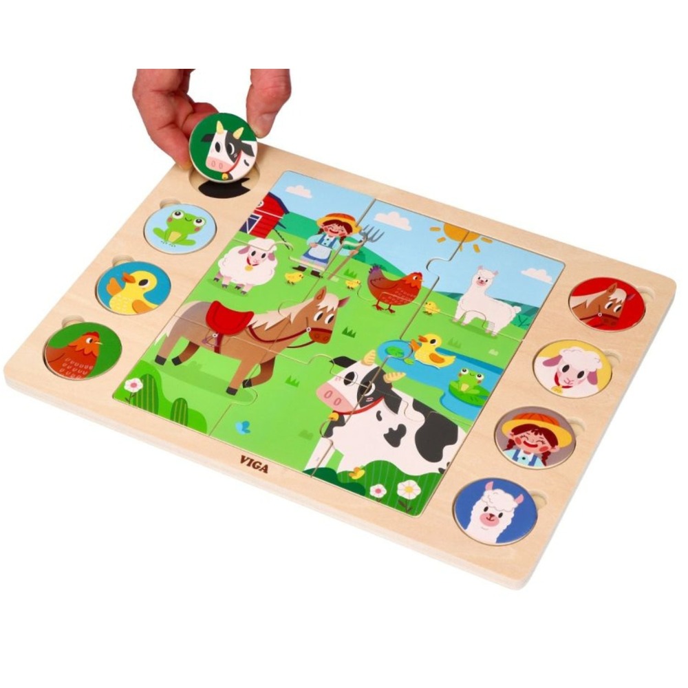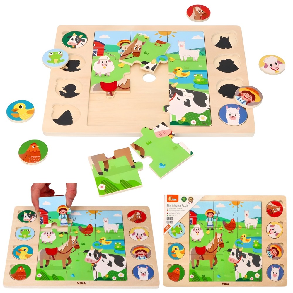 Puzzle 2w1 Farma – układanka i dopasowywanie cieni Viga – edukacyjna zabawka rozwojowa dla dzieci